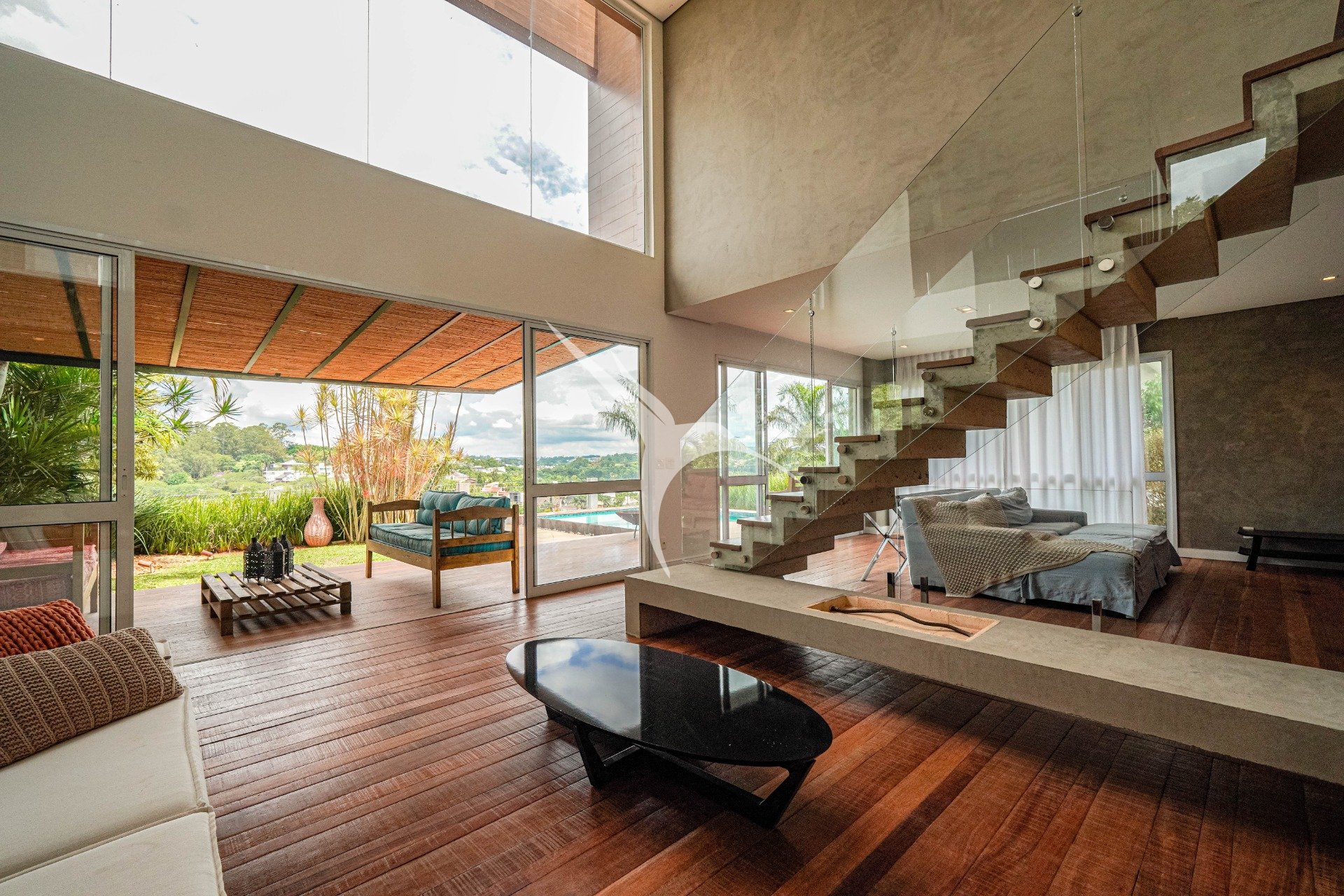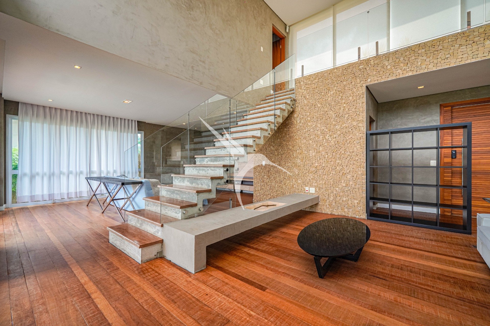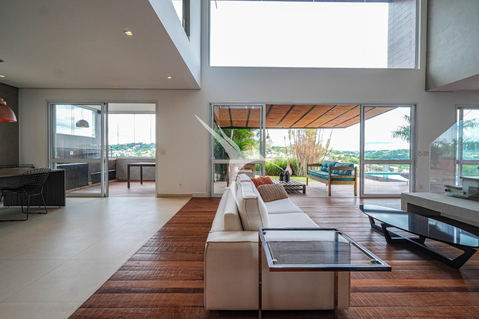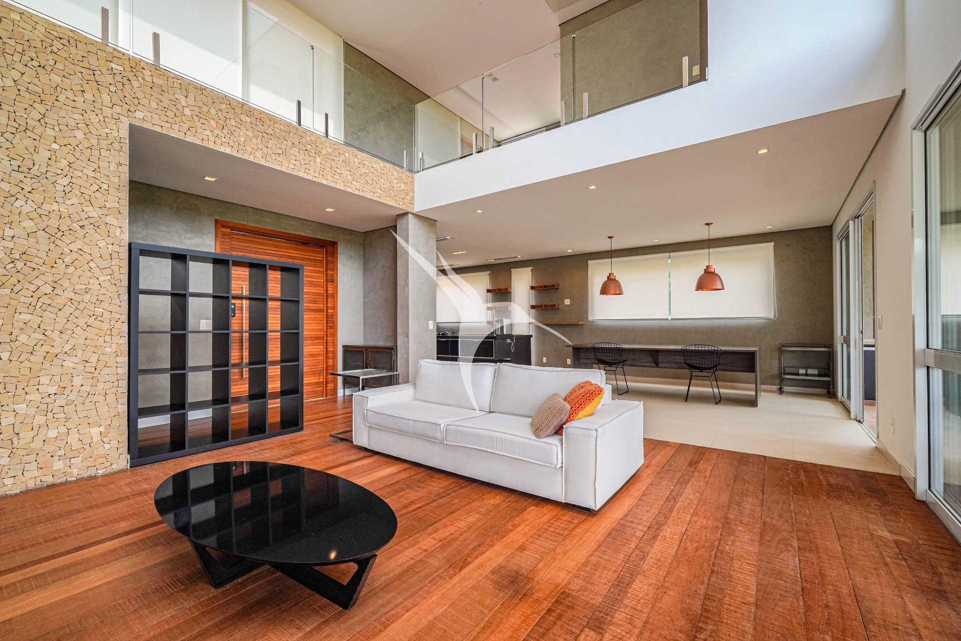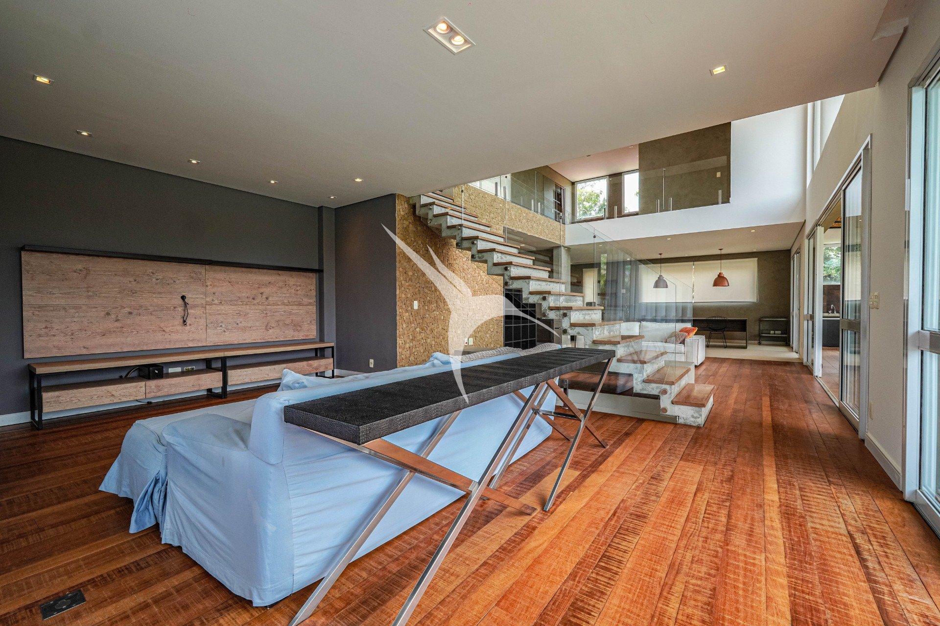 O projeto privilegia a amplitude. O pé-direito alto traz leveza aos ambientes e permite que a luz natural percorra toda a casa. O living foi desenhado para receber com elegância, com quatro ambientes integrados, criando um espaço fluido, acolhedor e perfeito tanto para o dia a dia quanto para momentos especiais.