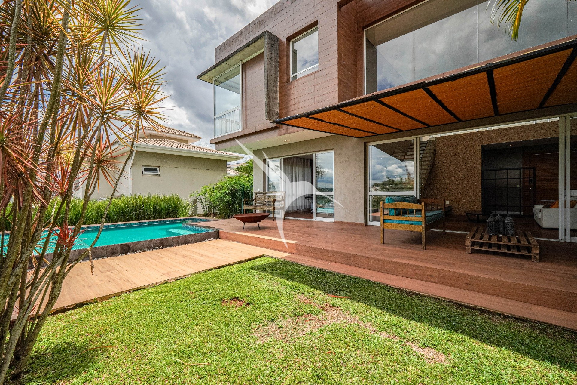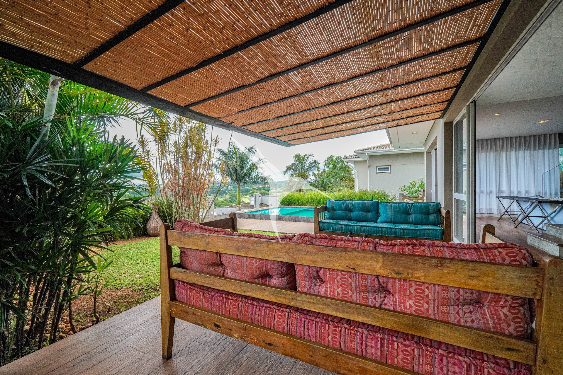 Todas as áreas sociais se abrem para o jardim, sempre acompanhadas por uma vista permanente para o campo de golfe, um cenário que muda de cor ao longo do dia e transforma cada momento dentro da casa.